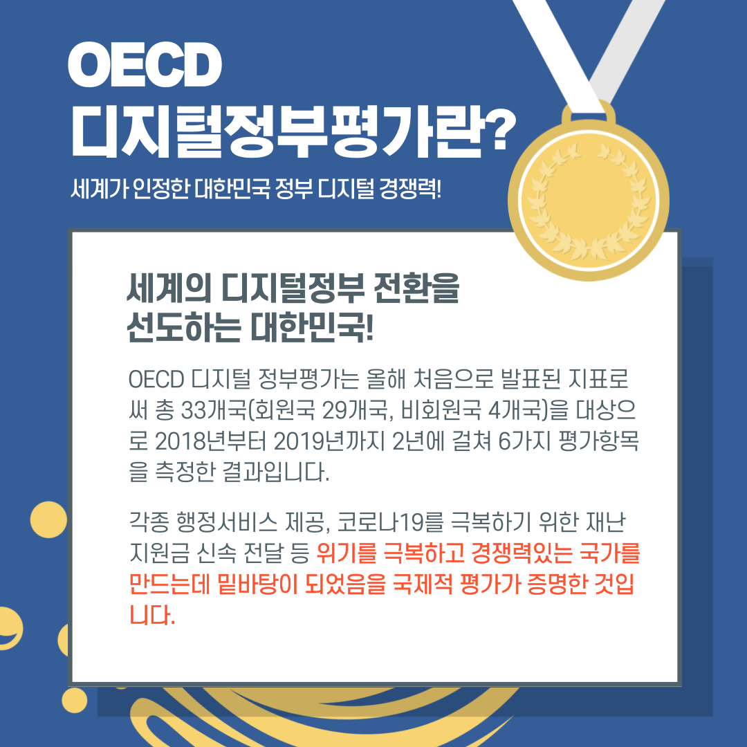 OECD 디지털정부평가는 올해 처음으로 발표된 지표로써 디지털전환 수준과 디지털정부 성숙도를 측정합니다. 총 33개국을 대상으로 2018년부터 2019년까지 2년에 걸쳐 6가지 항목을 측정한 결과 종합 1위를 하게 된 것입니다.