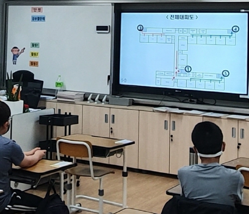 평소 같았으면 직접 사이렌이 울리고 화재대피훈련을 했을 텐데, 올해는 코로나19로 인해 모의 화재대피훈련 영상을 보고, 가상으로 체험해보는 시간을 가졌습니다. 실제 화재가 발생하면 전기가 끊어지고, 어둡고 연기가 자욱한 상황에 놓이게 되어 앞이 안 보일 수가 있습니다. 이때는 당황하지 않고, 비상구 불빛에는 비상전력이 몇 시간 동안 들어오게 되어 있어 그 불빛을 보고 밖으로 탈출하거나 복도나 계단에 손잡이가 있으니 그 손잡이를 잡고 이동하는 방법에 대해서 함께 살펴보았습니다.