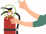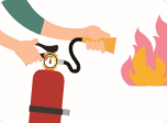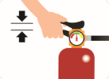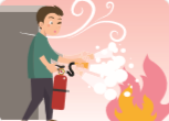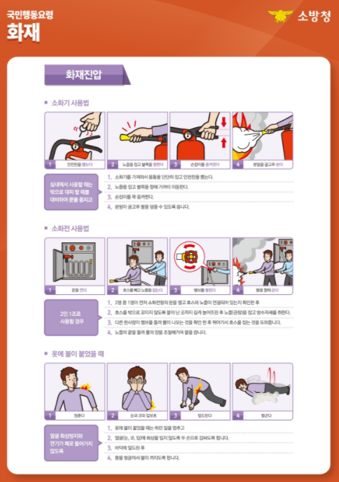 | ① 소화기를 가져와서 몸통을 단단히 잡고안전핀을 뽑는다. | ② 노즐을 잡고 불 쪽을 향해 가까이 이동한다 |