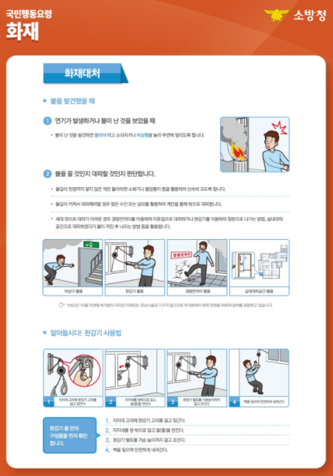 먼저 학생들과 함께 화재 대처, 화재진압 방법 등 사진 자료와 설명을 함께 읽어보고, 대표적으로 화재 발생 시 “불이야”라고 외치면서 주변 사람들에게 알리고 119에 신고하기, 엘리베이터 타지 않고, 계단으로 내려가기, 계단으로 내려갈 때는 고개를 숙이고, 소매나 화장지 등으로 입을 가리고 내려가기, 밑으로 못 내려갈 때는 옥상으로 올라가서 헬기 등 구조대가 올 때까지 기다리기 등 기본적이지만 우리가 간과할 수 있는 부분을 상기하는 시간을 가졌습니다.