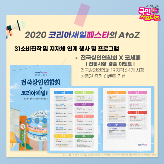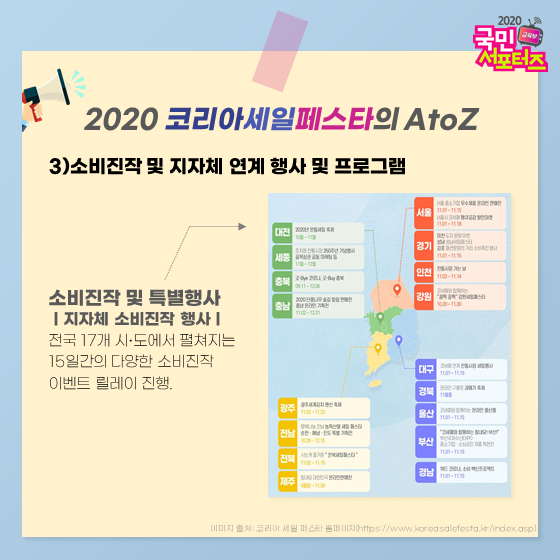 - 산업통상자원부 보도자료, '전국 17개 시·도 「2020 코리아세일페스타」 행사 추진계획 발표', 2020-10-16.