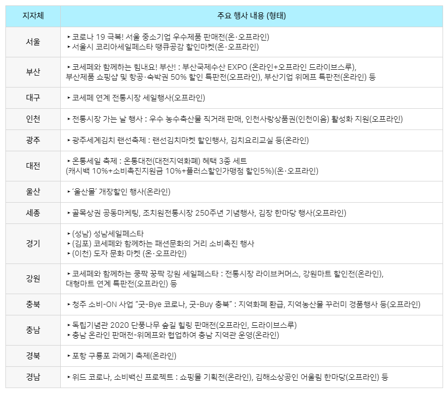 또 다른 예로 지자체의 소비진작 행사를 들 수 있습니다. 전국 17개 시·도에서 펼쳐지는 15일간의 다양한 소비진작 이벤트 릴레이는 코리아세일페스타의 문화적이고 지역적인 특성을 잘 드러내 보여줍니다. 각 지역별 주요 행사 내용에 대해서는 아래 표를 참고하시길 바랍니다:)