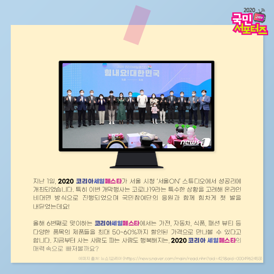 지난 11월 1일, 2020 코리아세일페스타가 서울 시청 '서울ON' 스튜디오에서 성공리에 개막식을 마쳤습니다. 특히 이번 행사는 코로나 19라는 특수한 상황을 고려해 온라인 비대면 방식으로 진행되었고 화상 연결을 통해 개막식에 참석한 국민참여단의 열렬한 응원 속에서 힘차게 첫발을 내디뎠습니다.