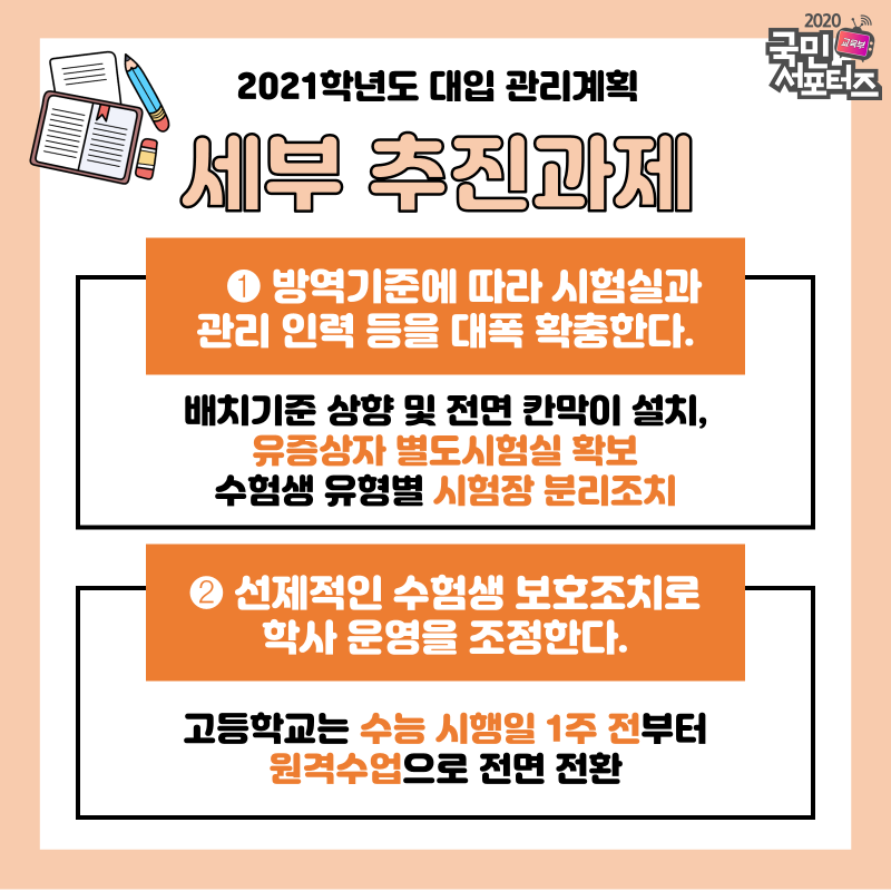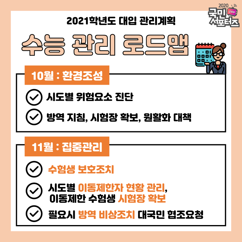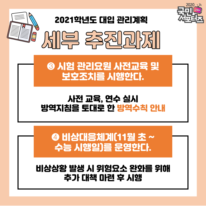 지금까지 2021년 대입 관리계획의 추진체계, 관리 로드맵, 세부 추진과제를 살펴보았습니다! 안전을 최우선으로 고려하는 응시환경과 방역환경 조성 등의 교육부 노력을 통해 수능이 차질없이 시행되기를 기대합니다. 지금 이 순간에도 열심히, 그리고 묵묵히 수능 준비를 하고 있을 전국 수험생들을 응원합니다.