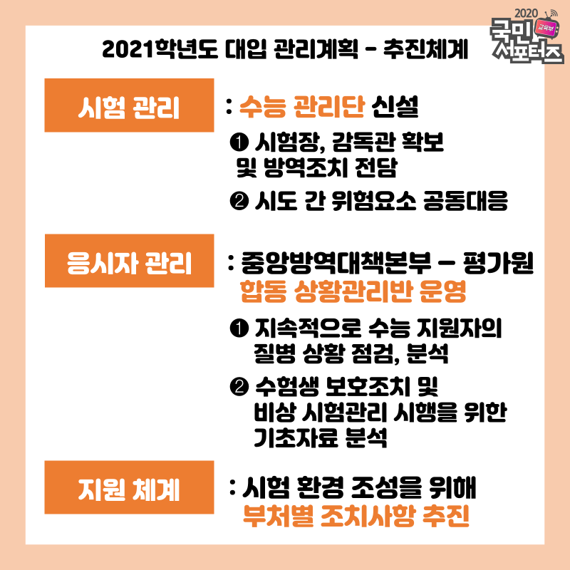 시험 관리를 위해 수능 관리단이 신설됩니다. 관리단은 시험장, 감독관 확보와 방역조치를 전담하며, 시도 간 위험요소를 대응하게 된다고 합니다. 또한 응시자들을 관리하기 위해 중앙방역대책본부와 평가원이 합동으로 상황관리반을 운영합니다. 지원자의 질병 상황을 점검하고 분석하며, 수험생 보호조치와 비상 시험관리 시행을 위해 기초자료를 분석합니다.