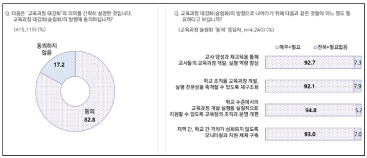 교사의 82.8%는 국가교육과정 대강화(슬림화)*에 동의하였으며, 교사의 92% 이상은 이를 실현하기 위한 교사들의 교육과정 개발ㆍ실행 역량 향상과 학교조직 재구조화, 교육청 조직ㆍ운영 개편 등이 필요하다고 생각하는 것으로 나타났다.