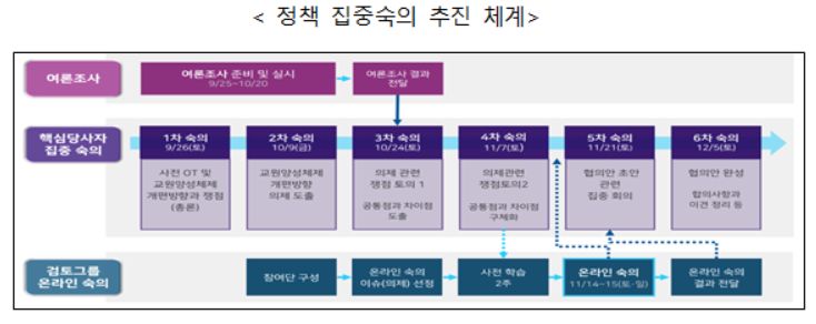 여기서 도출된 쟁점은 일반국민 300여명으로 구성된 ‘검토그룹 온라인 숙의단’에 전달되며, 검토그룹은 충분한 사전학습 후 11월 14~15일 양일간 40여개 분임으로 나뉘어 온라인 숙의를 진행하게 된다. 온라인 숙의의 결과는 다시 핵심당사자 집중숙의단에 전달된다. 이번 정책 집중숙의의 최종 결과는 오는 12월 협의문의 형태로 발표될 예정이며, 교육부는 이를 존중하여 향후 미래 교원양성체제 개편 방안 마련 시 기본 방향에 반영할 계획이다.