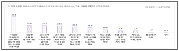 또한 교사들 역시 미래에 교사들에게 가장 중요하게 요구될 역량이 ‘다양한 학습자의 삶의 맥락, 발달 특성에 대한 이해와 소통역량’이라고 답해 국민이 바라는 교사의 역할과 일치하는 것으로 나타났다.