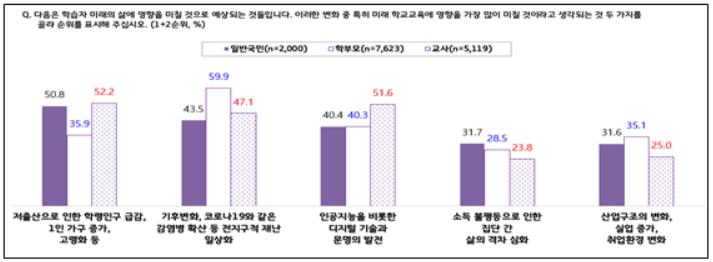 국민들은 미래의 학교 교육에 가장 큰 영향을 미치는 요인으로‘저출산으로 인한 학령인구 급감’‘감염병 등 전지구적 재난의 일상화’‘인공지능을 비롯한 디지털기술 발전’ 등을 꼽았다.