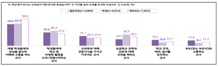 우리 국민은 가장 희망하는 교사의 상(像)으로 ‘개별 학생들에게 관심을 쏟으며 이해와 소통을 하는 교사’를 꼽았다. 그 다음은 ‘학생들에게 학교 밖 다양한 활동을 소개ㆍ연결시켜주는 교사’였다.