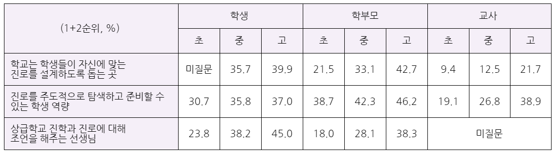 다만, 학교 급이 높아질수록 학생ㆍ학부모ㆍ교사 모두 진로 설계와 준비를 중시하는 것으로 나타났다. 학교 급이 높아질수록 학교는 ‘학생들이 자신에 맞는 진로를 설계하도록 돕는 곳’, 학생에게 필요한 역량은 ‘진로를 주도적으로 탐색하고 준비할 수 있는 역량’, 희망하는 교사상은‘상급학교 진학과 진로에 조언을 해주는 선생님’의 선택이 증가했다.