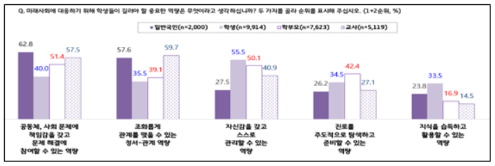 학생이 미래 사회에 대응하기 위해 길러야 할 중요 역량으로는 ‘공동체, 사회문제에 책임감을 갖고 문제해결에 참여할 수 있는 역량’과 ‘조화롭게 관계를 맺을 수 있는 정서-관계 역량’ ‘자신감을 갖고 스스로 관리할 수 있는 역량’등을 꼽았다. 특히 학생의 경우 ‘자신감을 갖고 스스로 관리할 수 있는 역량’을 1순위로 선택하였다.
