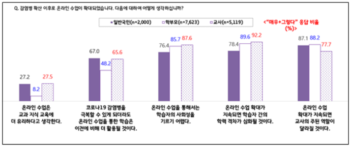 코로나19 이후 온라인 수업 확대 속에 일반국민·학부모·교사는‘온라인 수업이 교과지식 교육에 더 유리’하다고 생각하지 않았으며, 온라인 수업 확대로 인해 학생들의 ‘사회성 함양 어려움’과‘학력격차 심화’ ‘교사의 주된 역할 변화’가 나타날 것으로 보았다.