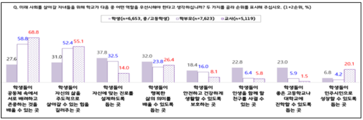 또한 학부모와 교사는미래에 학교가‘공동체 속 배려․존중을 배우는 곳’ ‘삶을 주도적으로 살아갈 힘을 길러주는 곳’이 되어야 한다고 답했고, 학생은 ‘자신에 맞는 진로를 설계하도록 돕는 곳’ ‘행복한 삶의 의미를 배울 수 있도록 돕는 곳’이 되어야 한다고 응답했다.