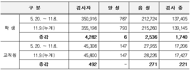 □ 등교 이후 진단검사 현황(11.10. 0시 기준)
