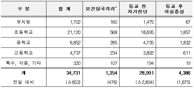 □ 학생 미등교 사유별 현황(11.9. 16시 기준)<단위 : 명>