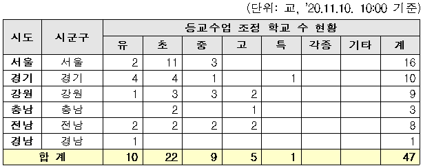 ㅇ 11.10.(10시 기준)6개 시·도 47개 학교가 등교 수업일 조정 중