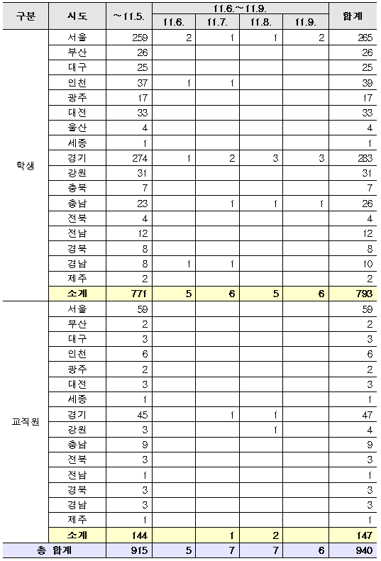 - 등교 이후 확진자 누계 11.9.(월) 00시 대비 학생 6명 증가 【누계 940명(학생 793명, 교직원 147명)】