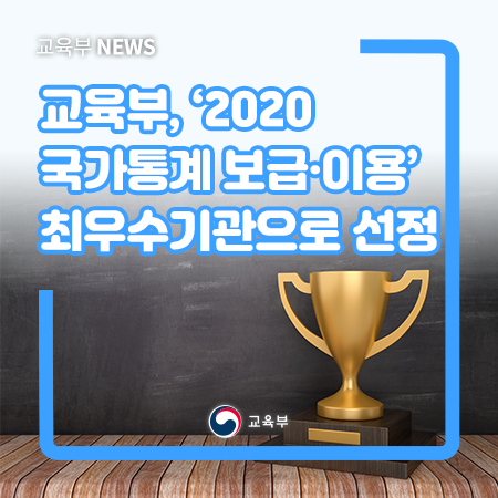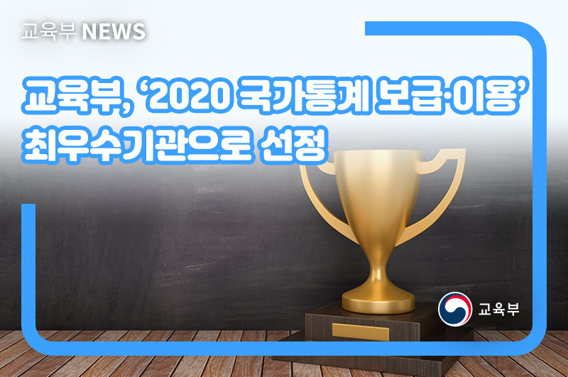 교육부(부총리 겸 교육부 장관 유은혜)는 통계청 주관으로 실시한‘2020년 국가통계 개발‧개선 및 보급․이용 활성화 기관 평가’에서 최우수기관으로 선정되었다.