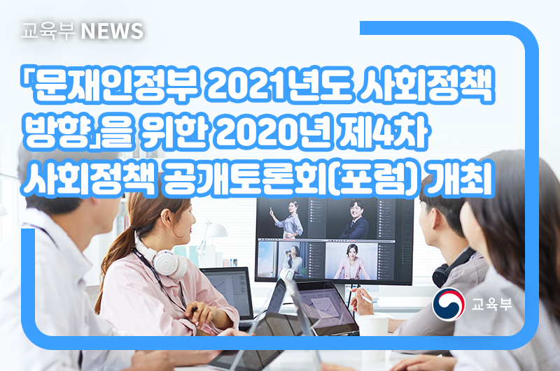 교육부(사회부총리 겸 교육부장관 유은혜)와 사회정책협력망*은 11월 13일(금) 오후 1시 30분부터 한국방송통신대학교 열린관 대강당에서 ‘문재인정부 2021년 사회정책 방향’을 주제로 제4차 공개토론회(포럼)를 개최한다.