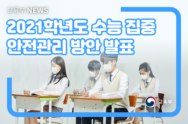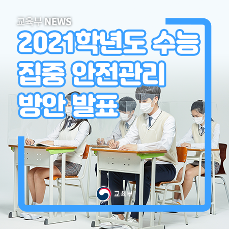 교육부(부총리 겸 교육부장관 유은혜)와 보건복지부(장관 박능후)는 모든 수험생의 안전을 확보하고 응시기회를 보호하기 위하여, 「2021학년도 수능 집중 안전관리 방안」을 ’20.11.15.(일) 중앙재난안전대책본부에 보고하고 발표하였다.
