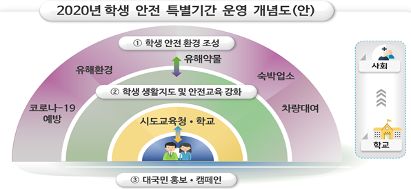 (학생안전특별기간 운영)수능 이후 학생들의 활동 확대 및 대학별평가 실시로 인한 이동량 증가가 예상되므로, 감염병 예방과 학교 내외의 안전사고 방지를 위해 안전교육과 생활지도를 강화하고, 유관 부처와 함께 특별기간을 운영한다. 12.3.(수능일)부터 12.31.까지 29일간을 ‘학생 안전 특별기간’*으로 지정하고, 많은 학생들이 이용할 것으로 예상되는 각종 시설을 대상으로 감염병 예방 등 안전관리와 지도・순찰을 강화한다. 학생들의 출입 가능성이 높은 시설을 중심으로 방역 관리를 실시하고, 청소년 음주·흡연 예방, 숙박업소 안전관리 등 감염병 예방 및 안전사고 발생 방지를 위한 조치들을 실시할 예정이다.