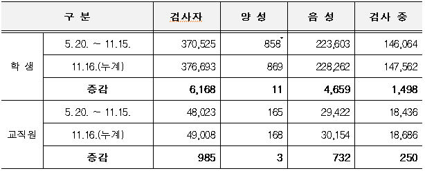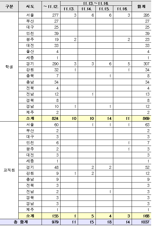 - 등교 이후 확진자 누계 11.16.(월) 00시 대비 학생 16명, 교직원 3명 증가 【누계 1,037명(학생 869명, 교직원 168명)】