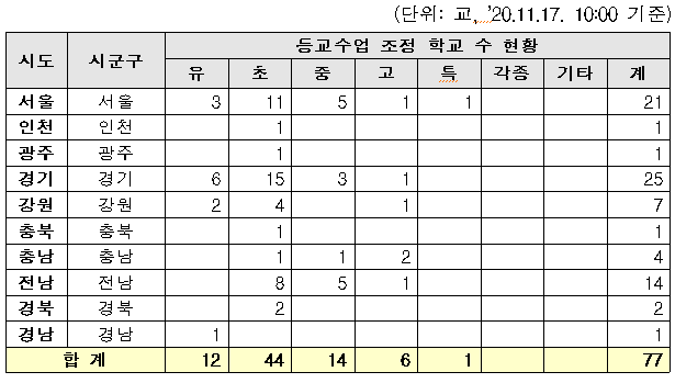 ㅇ 11.17.(10시 기준)10개 시·도 77개 학교가 등교 수업일 조정 중