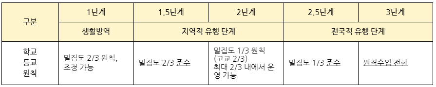 ◦ 이에, ‘거리두기 단계별 학사운영 기준’(11.1. 안내)에 따라 해당 지역 소재 학교는 학교 밀집도 2/3를 준수하여야 한다.