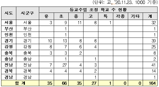 ㅇ 11.23.(10시 기준) 10개 시·도 164개 학교가 등교 수업일 조정 중