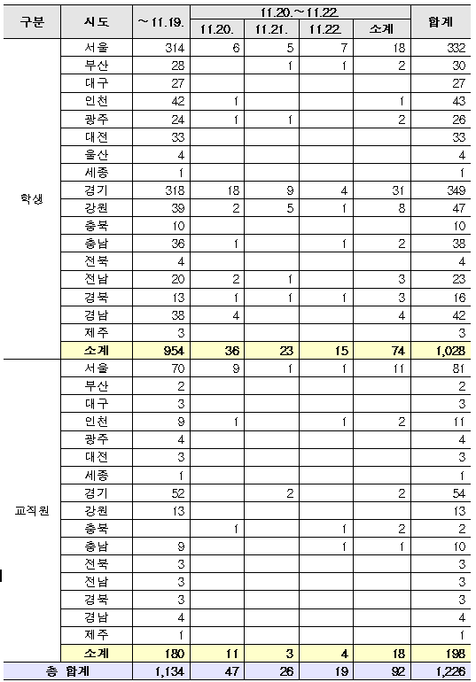 - 등교 이후 확진자 누계 11.20.(금) 00시 대비 학생 76명, 교직원 18명 증가 【누계 1,226명(학생 1,028명, 교직원 198명)】