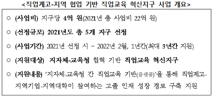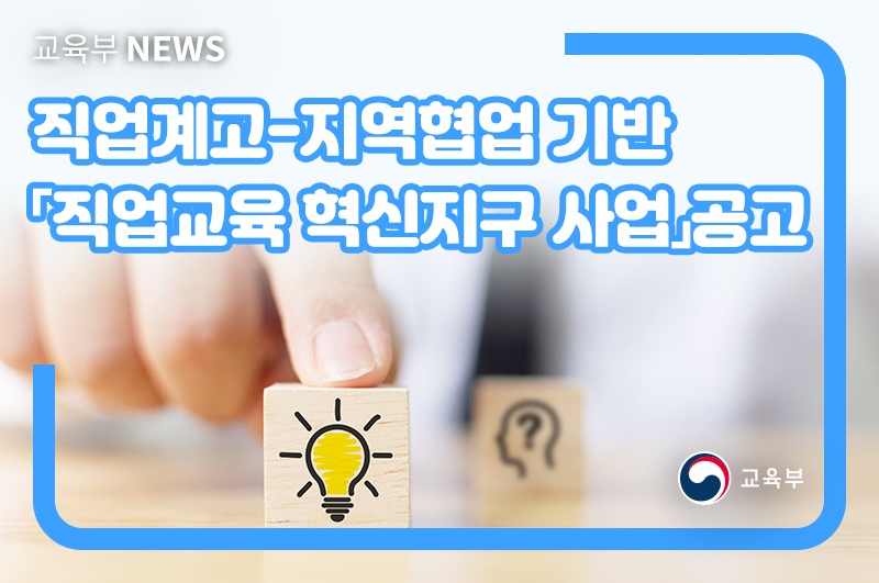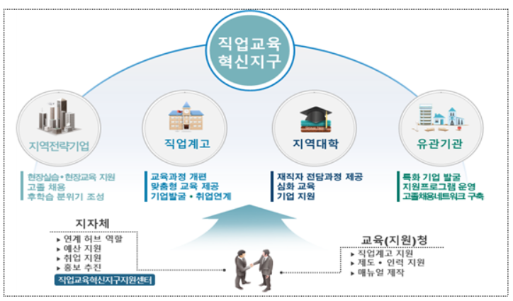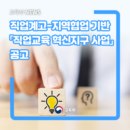 교육부(부총리 겸 교육부장관 유은혜)는 11월 25일(수) 직업계고-지역 협업 기반「직업교육 혁신지구 사업」을 공고하였다. ‘직업교육 혁신지구’란 지자체와 교육청이 협력*하여 지구 내 직업계고와 지역기업, 지역대학 간 연계를 통해 고졸 인재 성장을 지원하는 직업교육 기반(플랫폼)이다.