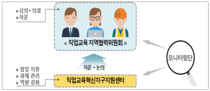 아울러, 이 사업의 성공적 추진을 위해서는 다양한 주체 간 협력이 필수적으로, 다원적인 의사결정과 협력을 돕는 추진 체계가 필요하다. 이에, 지자체와 교육청 간 협약 후 기관 간 협력을 주도할 ‘직업교육지역협력위원회*’와 사업을 주관할 전담 조직인 ‘직업교육혁신지구지원센터**’를 구성하도록 한다.