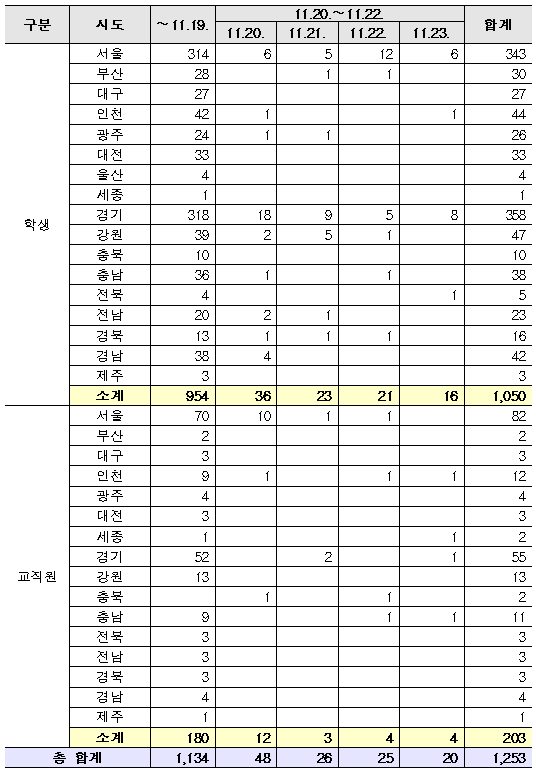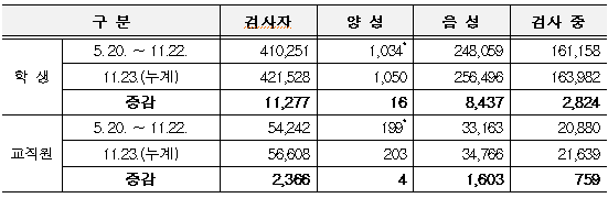 - 등교 이후 확진자 누계 11.23.(월) 00시 대비 학생 22명, 교직원 5명 증가