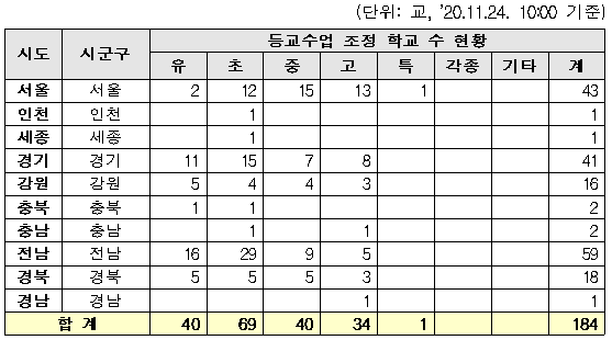 ㅇ 11.24.(10시 기준) 10개 시·도 184개 학교가 등교 수업일 조정 중