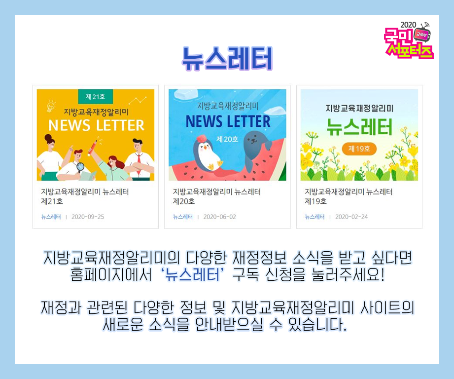 이런 지방교육재정알리미의 다양한 재정정보 소식을 정기적으로 받고 싶다면 알리미에서 제공하는 ‘뉴스레터’ 구독 신청을 하면 됩니다. 뉴스레터에서는 재정과 관련된 다양한 정보와 함께 지방교육재정알리미 사이트의 새로운 서비스를 소개하고 각종 공지사항을 알려주고 있어 교육재정에 관심 있는 분들에게 매우 유용할 것으로 생각됩니다.