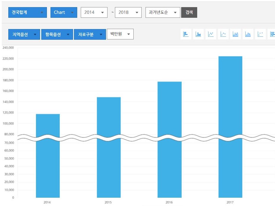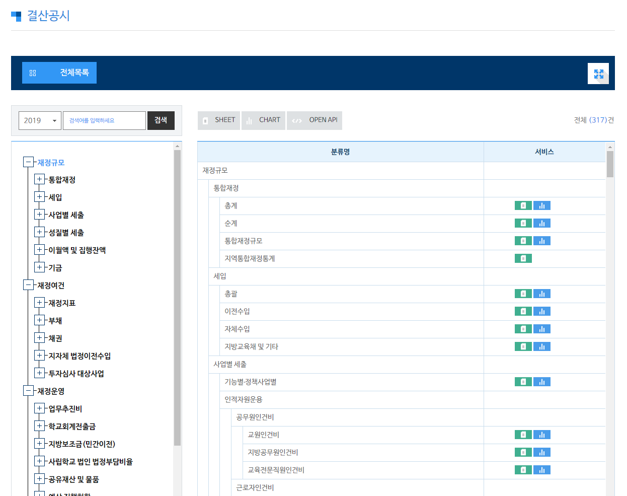 마지막 서비스는 바로 교육청재정 정보 제공 서비스입니다. 지방교육재정알리미는 전국 17개 시도교육청의 각 연도별 교육 예산 및 결산 정보를 제공하고 있습니다.