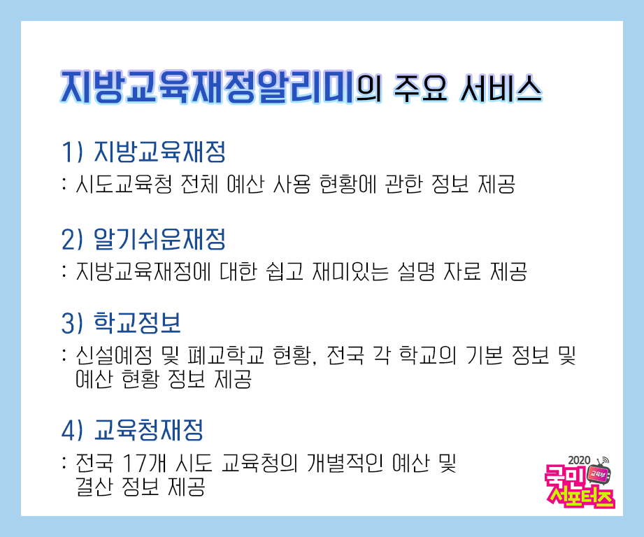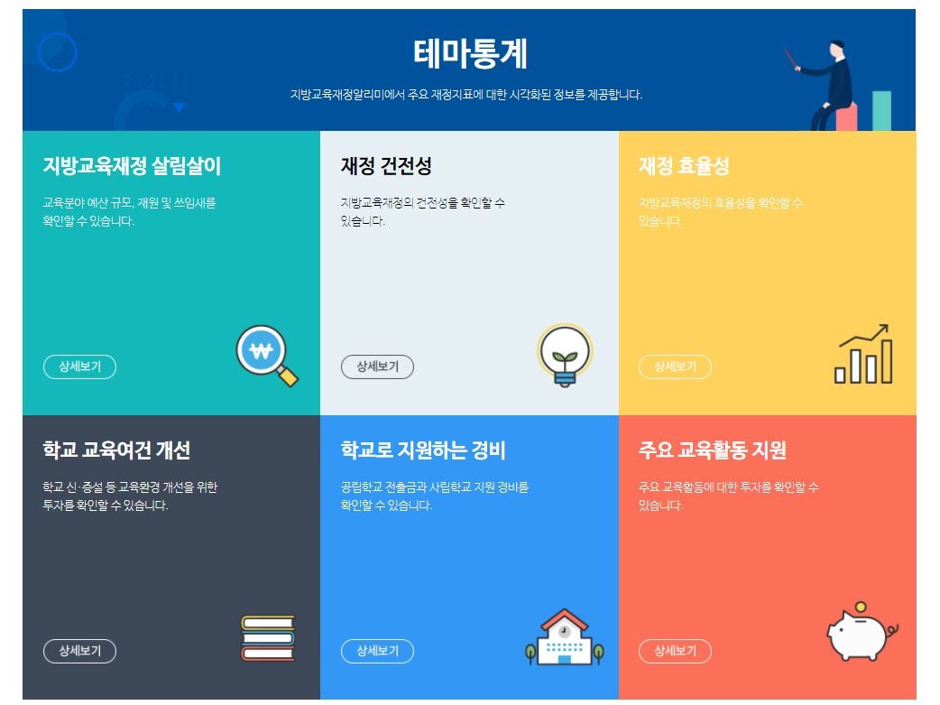 해당 서비스를 통해 우리나라 전체의 지방교육재정을 아주 자세하게, 그리고 한눈에 파악할 수 있을 뿐 아니라 전국 17개 시도교육청에서 추진하고 있는 사업에는 어떤 것들이 있는지, 시도교육청의 구체적인 역할은 무엇인지 등을 함께 알아볼 수 있답니다.