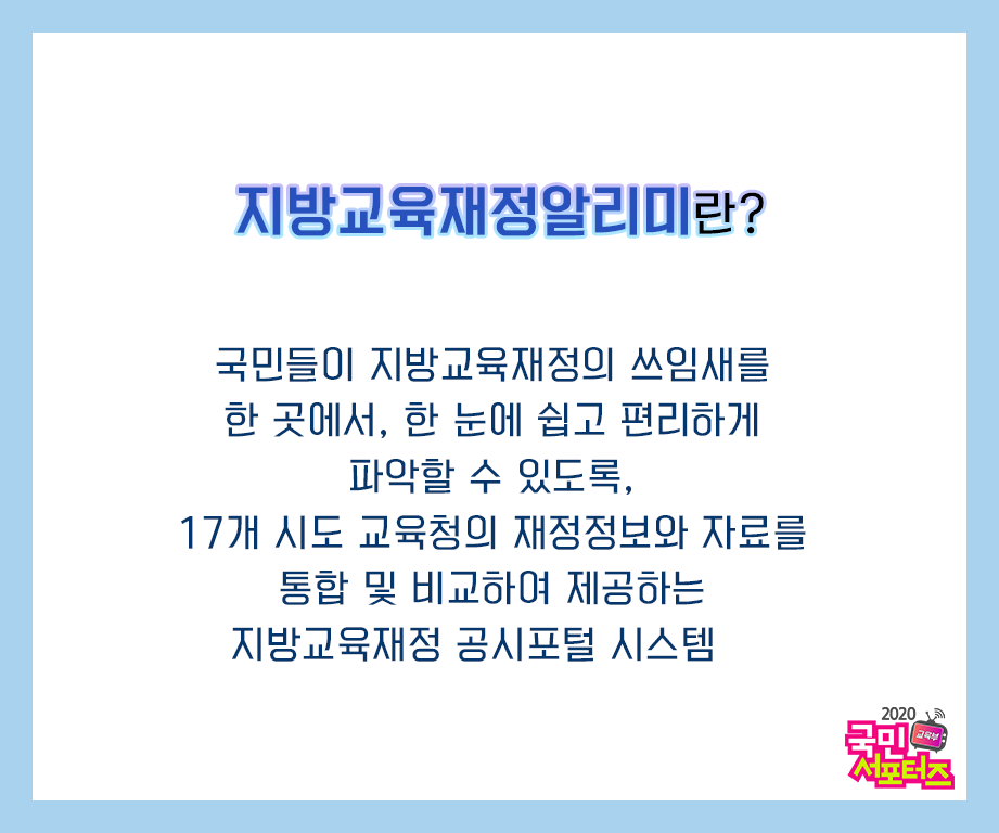 지방교육재정알리미는 국민들이 지방교육재정의 쓰임새를 한 곳에서, 한눈에 쉽고 편리하게 파악할 수 있도록, 17개 시도교육청의 재정정보와 자료를 통합 및 비교하여 제공하는 지방교육재정 공시포털 시스템입니다.