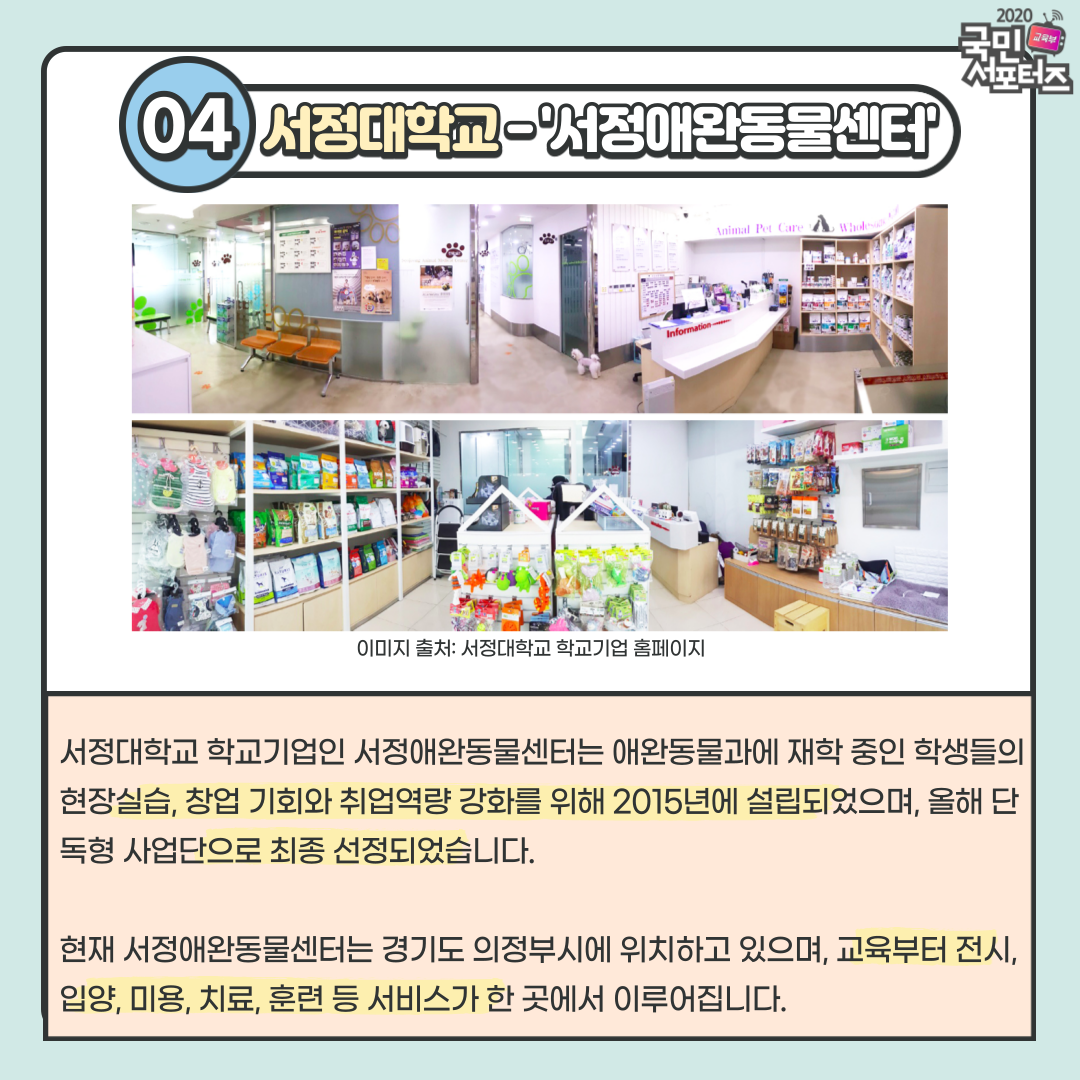 서정대학교 학교기업인 서정애완동물센터는 애완동물과에 재학 중인 학생들의 현장실습, 창업 기회와 취업역량 강화를 위해 2015년에 설립되었으며, 올해 단독형 사업단으로 최종 선정되었습니다. 현재 서정애완동물센터는 경기도 의정부시에 위치하고 있으며, 교육부터 전시, 입양, 미용, 치료, 훈련 등 서비스가 한 곳에서 이루어집니다. 최근에는 서정대학교 학교기업이 고영시기업 경제인연합회와 ‘학생들의 취업지원 및 진로지도’를 주요 내용으로 하는 업무협약을 체결하였습니다. 이번 협약을 통해 학생들이 직접 또는 간접적으로 실무 체험 기회가 확대되었을 뿐만 아니라 현장실습 및 연수 기회도 확대되었다는 장점이 존재합니다.