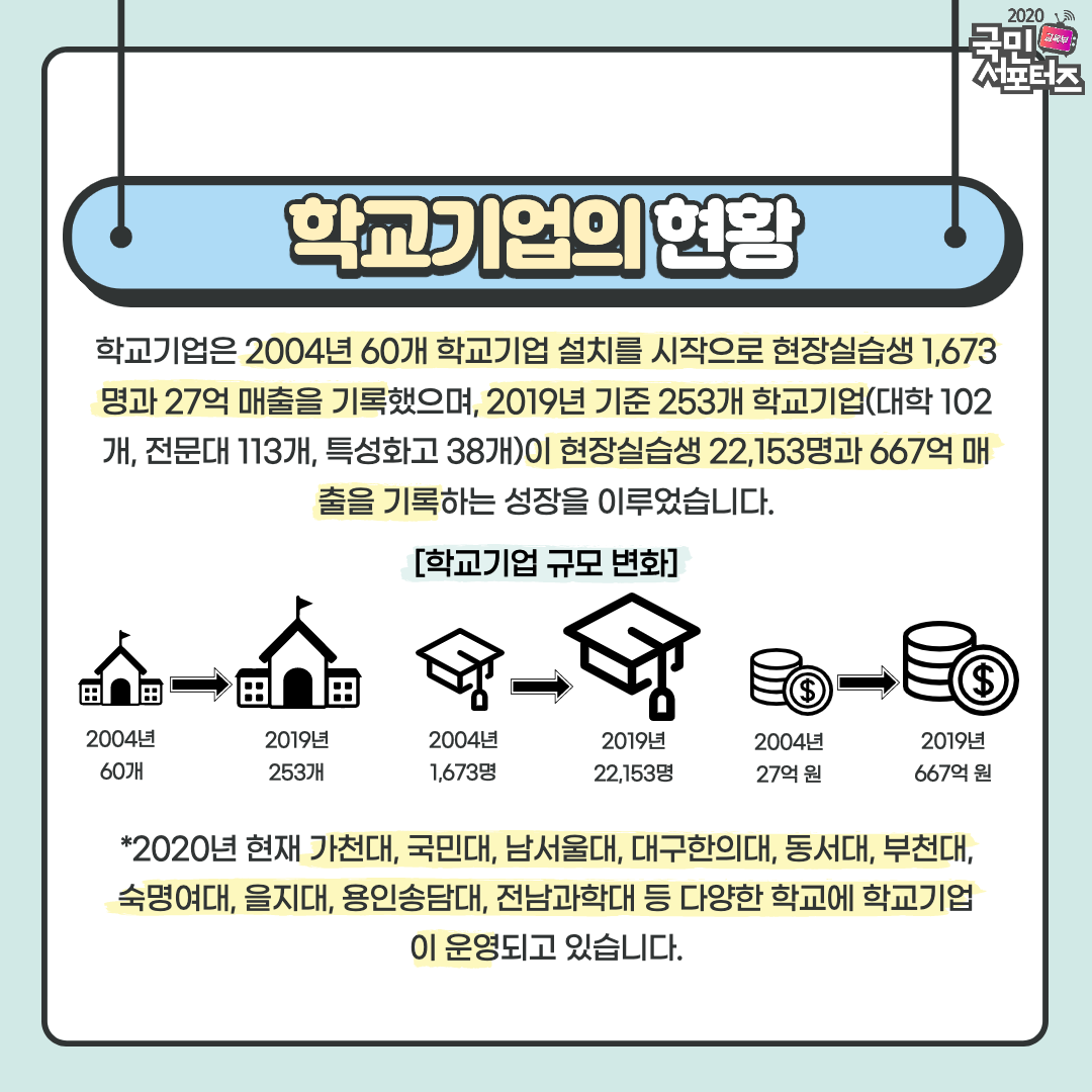 학교기업은 2004년 60개 학교기업 설치를 시작으로 현장실습생 1,673명과 27억 매출을 기록하였고, 2019년 253개 학교기업(대학 102개, 전문대 113개, 특성화고 38개)이 현장실습생 22,153명과 667억 매출을 기록하는 성장을 이루었습니다.