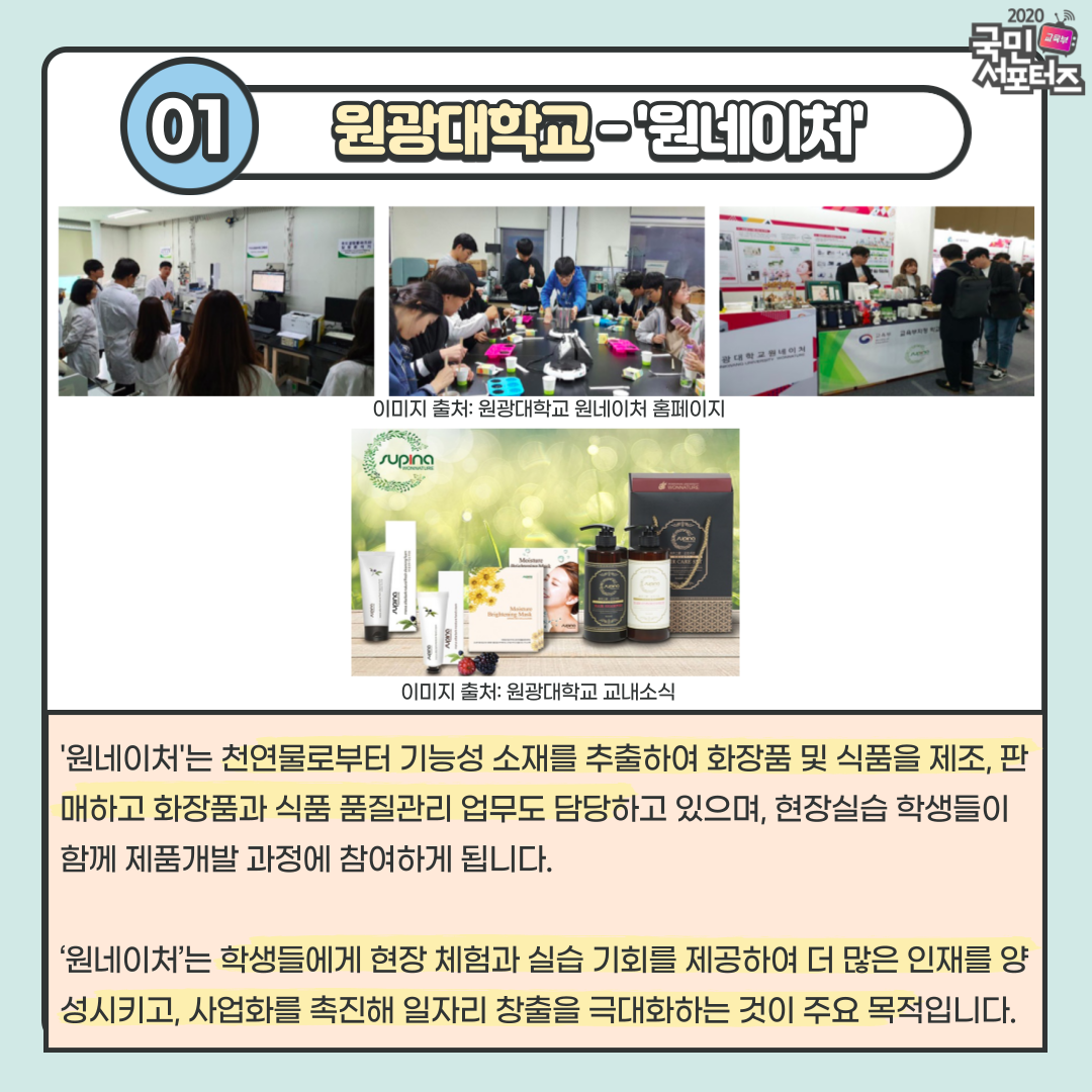원광대학교 학교기업은 2015년 9월에 설립되었으며, 주로 천연물로부터 기능성 소재를 추출하여 화장품 및 식품을 제조, 판매하고 있습니다. 이 외에도 바이오 분야 고가 장비를 구축하고 있어 화장품과 식품의 품질관리 업무도 담당하고 있습니다. 현재 ‘원네이처’에서 주력 화장품 브랜드인 ‘수피나’는 다양한 천연물 추출물 연구를 통해 피부에 효과적인 유효성분을 발굴하여 원광대가 보유한 특허 기술을 기반으로 제품화되었습니다. ‘수피나’는 마스크팩뿐만 아니라 핸드크림, 클렌징폼, 샴푸, 컨디셔너 등 다양한 제품을 참여 교수와 현장실습 학생들이 함께 제품개발 과정에 참여하여 출시되었습니다. 이처럼 ‘원네이처’는 학생들에게 현장 체험과 실습 기회를 제공하여 더 많은 인재를 양성시키고, 개발된 기술을 민간 부분에 이전하여 사업화를 촉진해 일자리 창출을 극대화하는 것이 주요 목적입니다. 특히 원광대학교 학교기업 ‘원네이처’는 2019년 교육부 주관 학교기업 지원사업 워크숍에서 대표 우수사례 선정을 이어 2020년에는 3단계 학교기업 지원사업에 선정되었습니다. 앞으로 5년간 사업비를 지원받아 다양한 기관 협력과 프로그램 운영을 통해 더 많은 인재를 양성하기를 기대합니다.