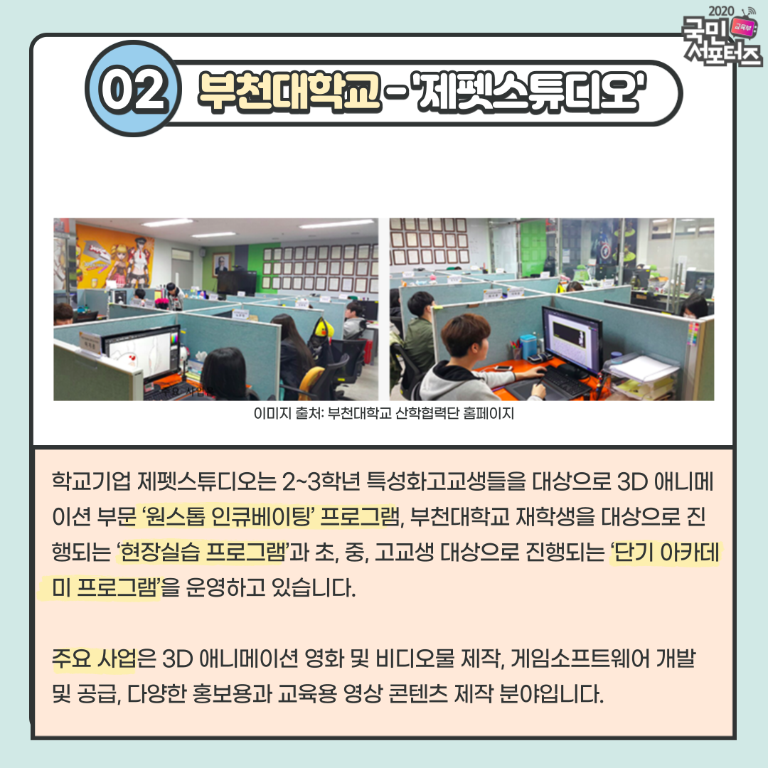 부천대학교 학교기업인 제펫스튜디오는 2015년도에 설립되었고 2020년도 3단계 연합형 학교기업지원사업에 자원하여 선정되었습니다. 학교기업 제펫스튜디오는 2~3학년 특성화고교생들을 대상으로 3D 애니메이션 부문 ‘원스톱 인큐베이팅’ 프로그램을 운영하고 있으며, 1단계 -단기 인큐베이팅 프로그램 학습, 2단계 -현장실습 참여 프로그램, 3단계 -실무 적용으로 프로그램이 이루어집니다. 이 뿐만 아니라, 부천대학교 재학생을 대상으로 ‘현장실습(3시간 콘텐츠 제작 기술교육+ 5시잔 실무 프로젝트 참여) 프로그램’과 초, 중, 고교생 대상으로 진행되는 ‘단기 아카데미 (3D 애니메이션/모션그래픽) 프로그램’을 운영하고 있습니다. 현재 진행 중인 주요 사업은 3D 애니메이션 영화 및 비디오물을 제작하고 게임소프트웨어까지 개발 및 공급하는 것입니다. 이 외에도 다양한 홍보용과 교육용 영상 콘텐츠를 제작하고 있습니다.