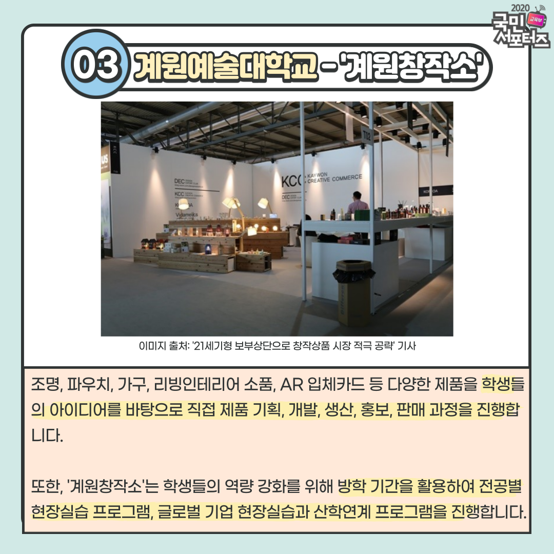 계원예술대학교도 역시 교육부와 한국산업기술진흥원에서 공동 주관하는 3단계 학교기업 지원사업에 선정되었습니다. 원래 계원창작소는 리빙디자인, 애니메이션과 다자인 굿즈 사업을 운영해 왔으나, 올해부터는 4차 산업혁명의 주요 분야인 3D 및 AR/VR 분야를 추가하여 새로운 모습을 보일 예정입니다. 따라서 조명, 파우치, 가구, 리빙인테리어 소품, AR입체 카드 등 다양한 제품을 학생들의 아이디어를 바탕으로 직접 제품 기획, 개발, 생산, 홍보, 판매 과정으로 이뤄집니다. 특히 올해 코로나19로 인해 온라인 콘텐츠를 확대함으로써 다양한 굿즈 및 제품을 V-Shop을 통해 판매하여 수익을 창출하였습니다. 이 외에도 계원창작소는 학생들의 역량 강화를 위해 방학 기간을 활용하여 전공별 현장실습 프로그램, 글로벌 기업 현장실습과 산학연계 프로그램 등을 통해 제품 개발을 실행하고 있습니다.