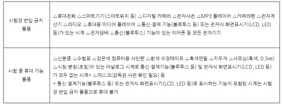 시험 당일 모든 전자기기는 시험장에 반입할 수 없으므로 시험장 반입금지 물품은 집에 두고 오는 것이 최선이며, 시계는 통신·결제기능(블루투스 등)과 전자식 화면표시기(LCD, LED 등)가 없는 아날로그시계만 허용된다. 만약 미처 두고 오지 못한 전자기기가 있다면 1교시 시작 전까지 감독관의 지시에 따라 제출해야 하고, 제출하지 않고 있다가 적발될 경우에는 즉시 부정행위로 간주되어 시험이 무효 처리된다.