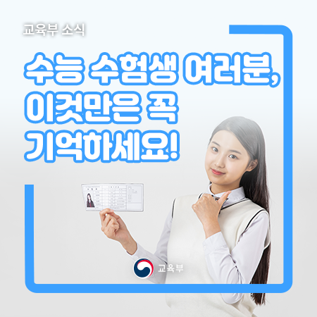 교육부는 수험생들이 유의사항을 보다 쉽게 접하고 숙지할 수 있도록 영상물, 카드뉴스 등 다양한 종류의 관련 홍보자료*를 제작하여 배포해 왔다. 수험생 유의사항 관련 자료와 자세한 내용은 교육부(www.moe.go.kr)와 한국교육과정평가원(www.kice.re.kr) 누리집에서 확인할 수 있다.
