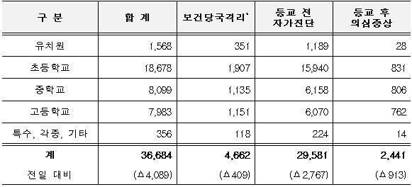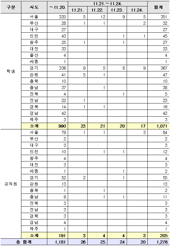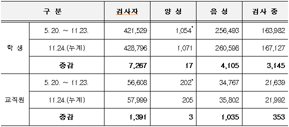 - 등교 이후 확진자 누계 11.24.(화) 00시 대비 학생 21명, 교직원 3명 증가