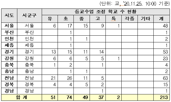 ㅇ 11.25.(10시 기준) 11개 시·도 213개 학교가 등교 수업일 조정 중