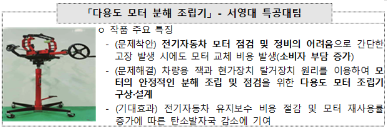 ‘특공대(특수한 공구를 만드는 대학생들)팀(서영대)’은 친환경 전기자동차 수요가 급증하는 사회 변화에 주목하여, 자동차 유지·보수를 위한 다용도 모터 분해 조립기를 개발하여 대상을 수상하였다.