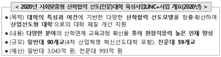 교육부는 현장적응력과 문제해결력을 함양한 인재를 양성하고자 ‘2020년 사회맞춤형 산학협력 선도(전문)대학 육성사업’(2017~2021년)을 통해 현장실습, 캡스톤 디자인, 사회맞춤형학과 등 다양한 대학 내 산학연계 교육과정 확산을 지원하고 있다.